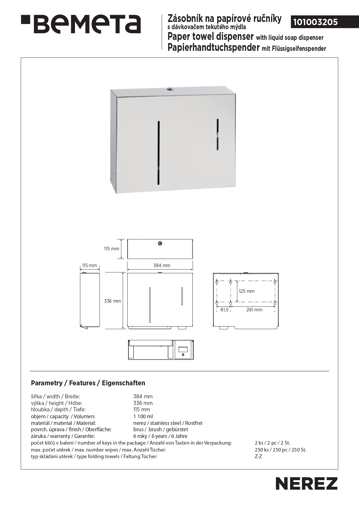 101003205 Диспенсер для бумажных полотенец с дозатором для мыла 1100 мл, нерж. сталь, мат