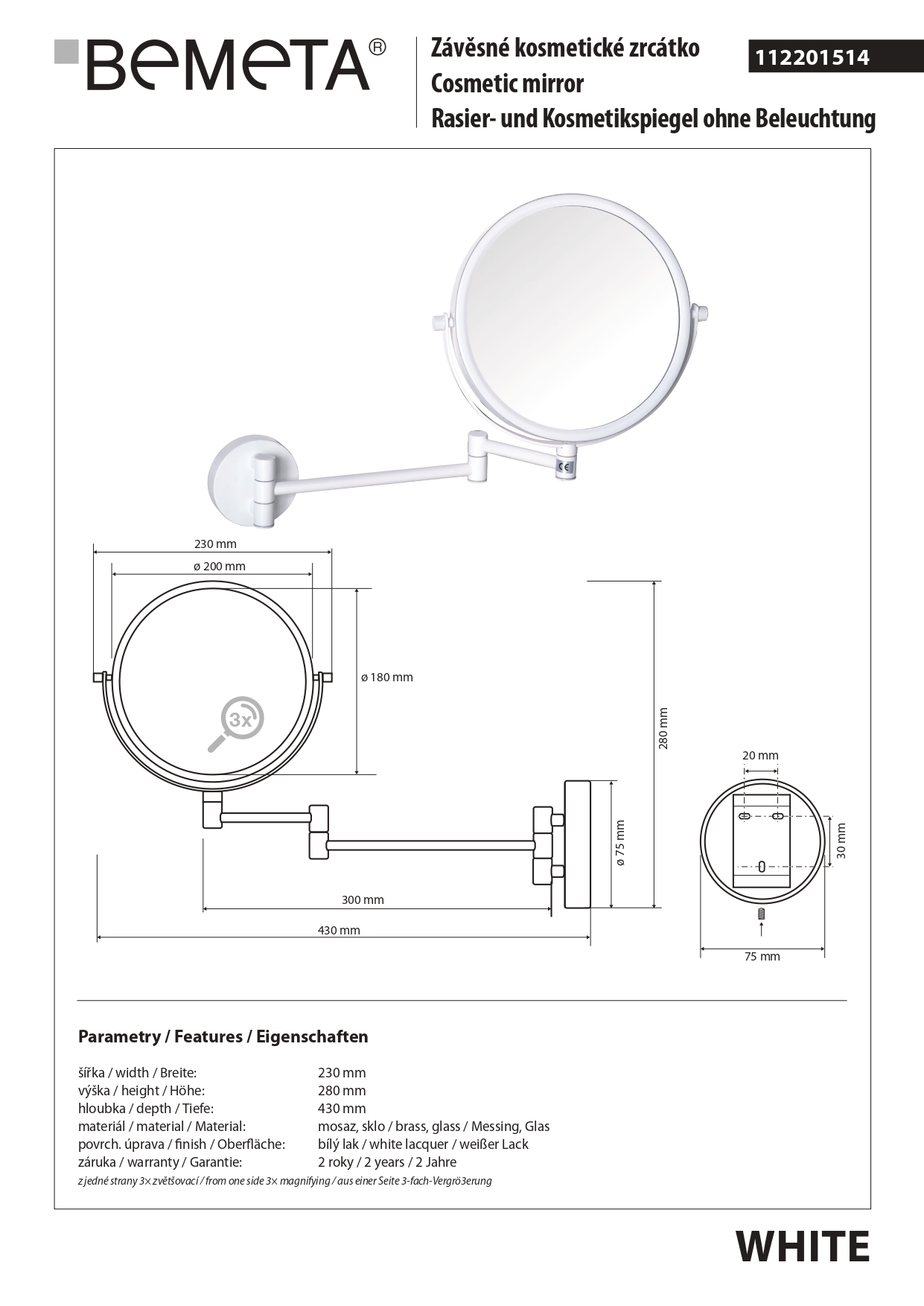 112201514 Косметическое зеркало WHITE 190мм