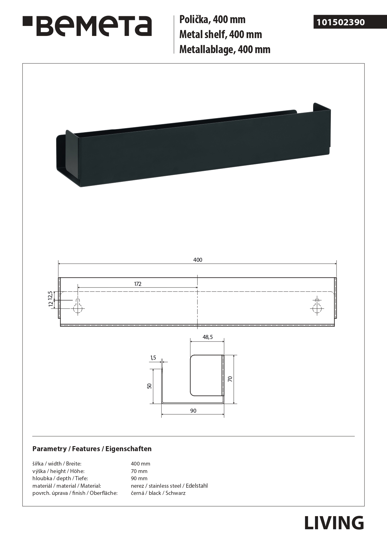 101502390 LIVING: Душевая полка, 400 мм, нержавеющая сталь, черный