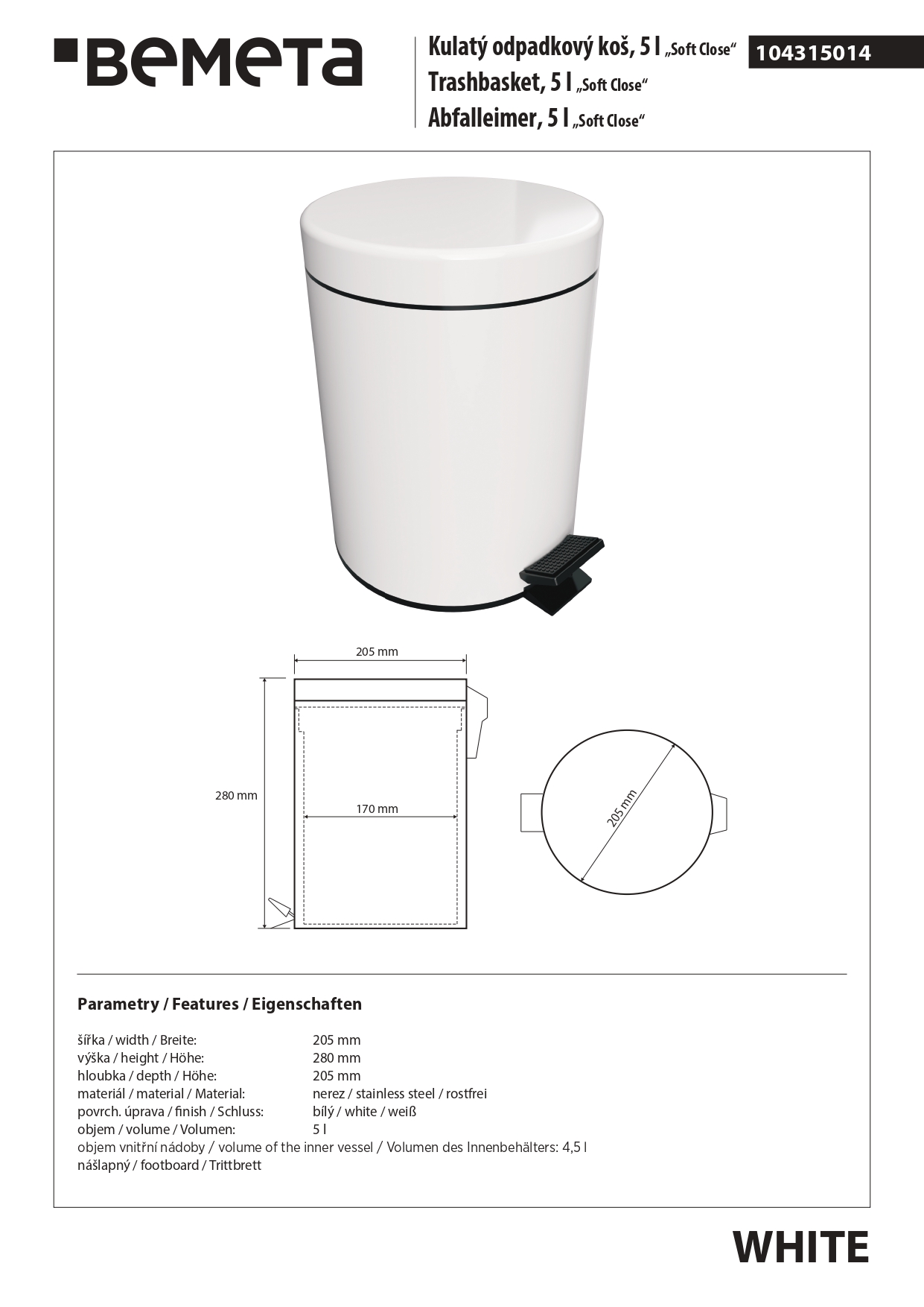 104315014 HOTEL Ведро 5 L, белое