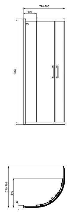 Высота 195 см, радиус 55 см, безопасное прозрачное стекло 6 мм, антиизвестковое покрытие Ideal Clean, алюминиевый профиль Bright silver, хромированные ручки 225 мм, функция “Click & clean”, ролики с плавным ходом, регулировка профиля до 25 мм, возможно комбинировать с фиксированной боковой панелью L (только в качестве третьей стороны ограждения).