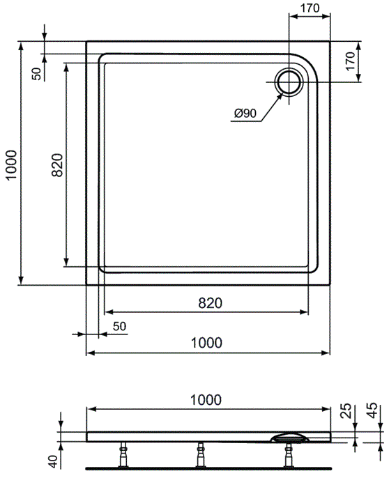 E105401 CONNECT AIR Акриловый квадратный душевой поддон 100х100 см; рекомендуемый сифон - T8520AA или J3417AA (заказывается дополнительно). Ножки K712667 и крепеж K725567 заказываются дополнительно.