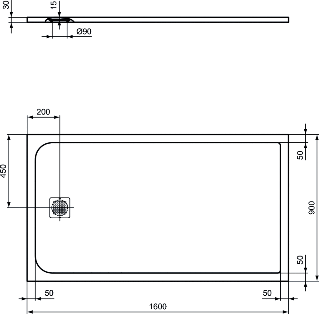 K8277FR ULTRAFLAT S Прямоугольный мраморный душевой поддон 160х90 см. Декоративная прямоугольная накладка слива из нержавеющей стали в комплекте; ножки K936467 и система слива K936367 заказываются дополнительно