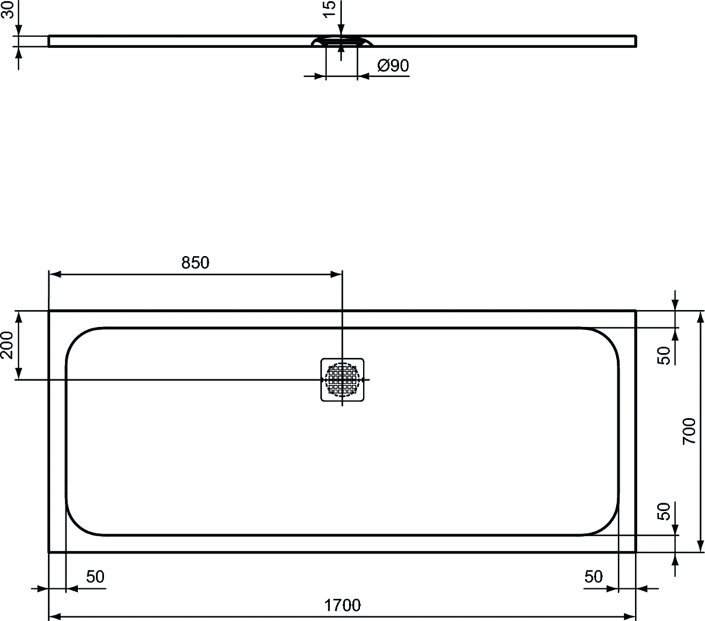 K8281FR ULTRAFLAT S Прямоугольный мраморный душевой поддон 170х70 см. Декоративная прямоугольная накладка слива из нержавеющей стали в комплекте; ножки K936467 и система слива K936367 заказываются дополнительно