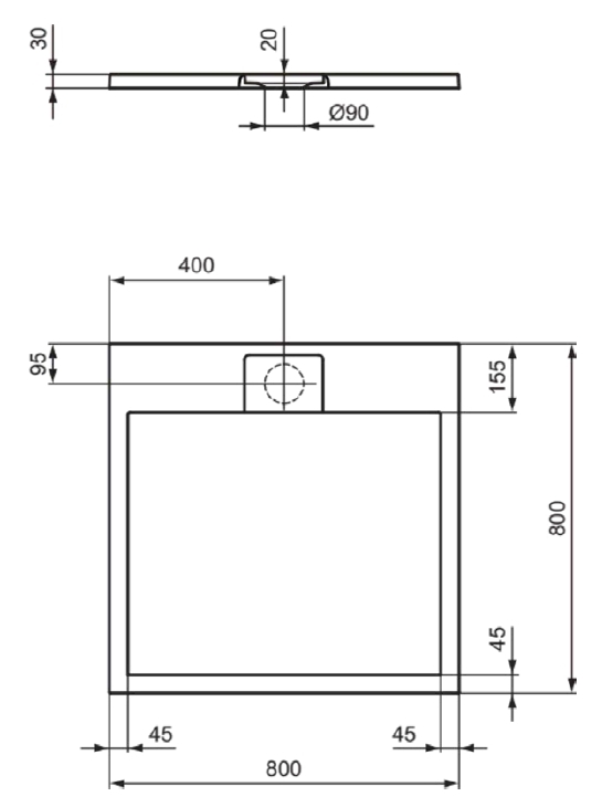 Возможно уменьшение размера путем резки. Слив Ø90 мм K936367 и крепежный комплект K936467 заказываются дополнительно (для поддонов размером более 1000 мм необходимо 2 крепежных комплекта)