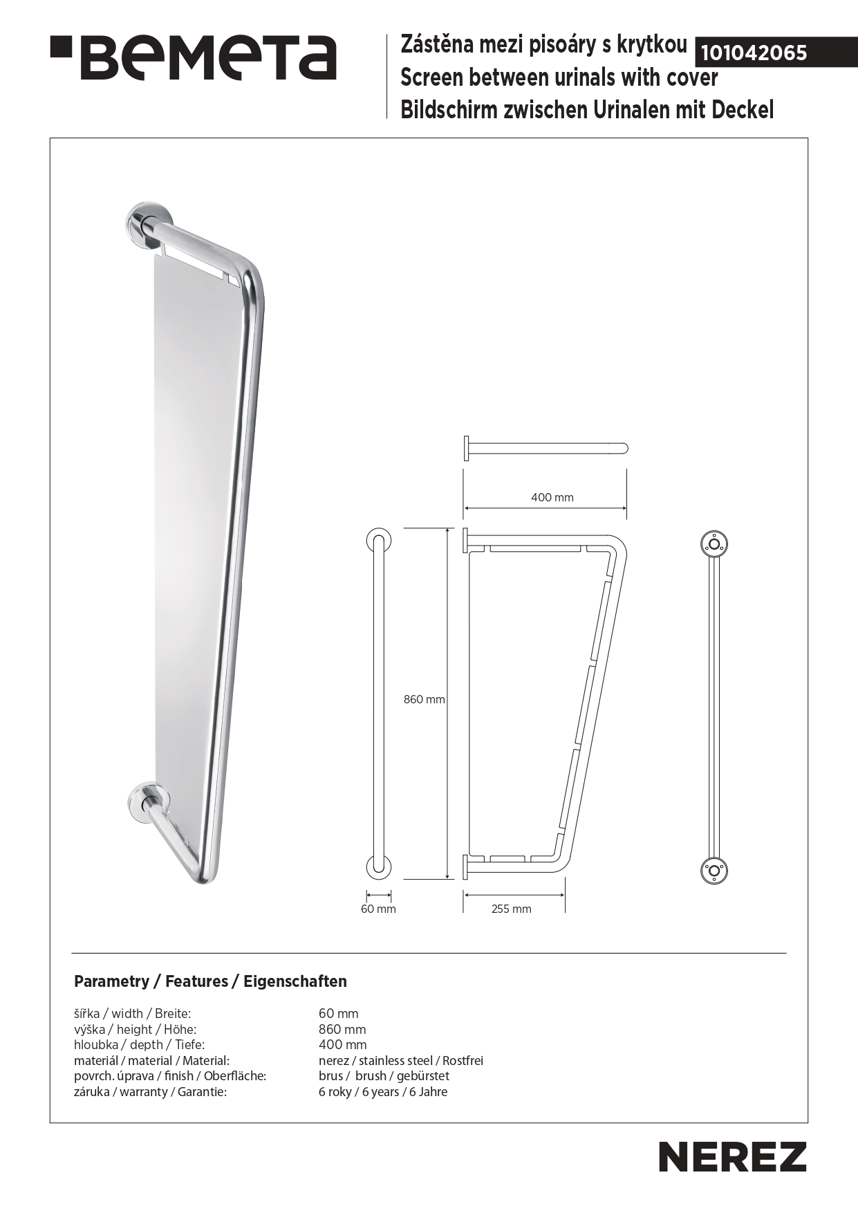 101042065 Перегородка между писсуарами, нерж. сталь, мат