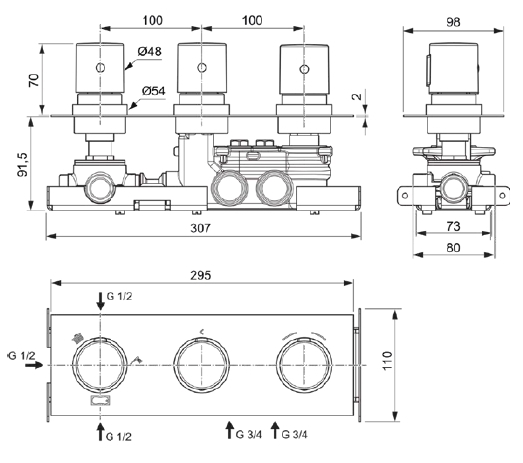 CERATHERM C100 Встраиваемый термостатический смеситель для ванны/душа на 3 выхода (верхний душ, ручной душ, излив для ванны), полный комплект (внешняя + встраиваемая части).