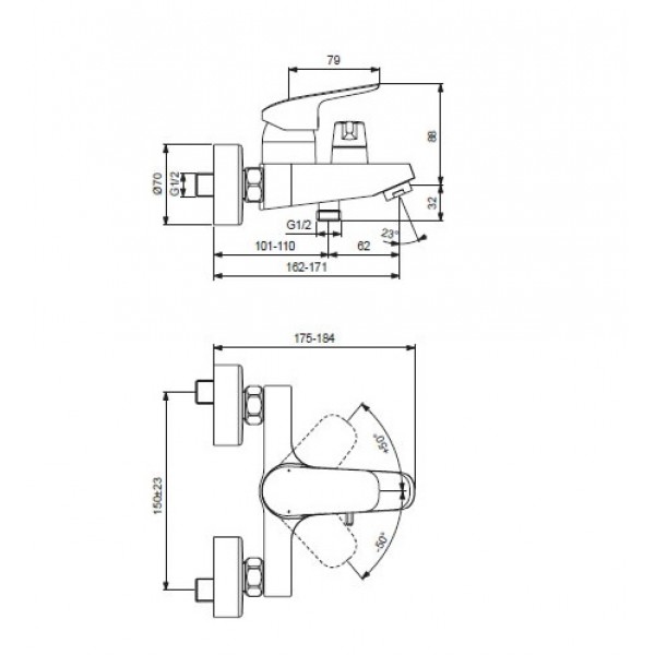 B1740AA CERAFLEX Настенный смеситель для ванны/душа, с керамическим переключателем, монтаж на стандартных эксцентриках (в комплекте: эксцентрики, металлические отражатели, уплотнительные прокладки)