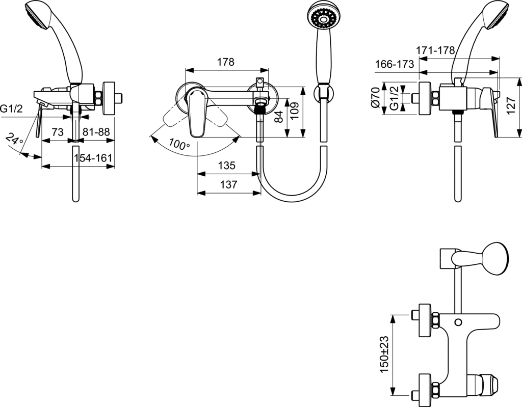 BA267AA VIDIMA BALANCE Настенный смеситель для ванны/душа, монтаж на стандартных эксцентриках (в комплекте: эксцентрики, металлические отражатели, уплотнительные прокладки) SmartFix, литой излив 154-161 мм, аэратор Perlator, керамический картридж 35 мм, металлическая рукоятка с индикаторами горячей / холодной воды, переключение ванна/душ -ручное (позволяет использовать функцию "душ" даже при очень низком давлении воды), душевой гарнитур в комплекте (душевая лейка Ø70 мм, металлический шланг 1500 мм, держатель для лейки)